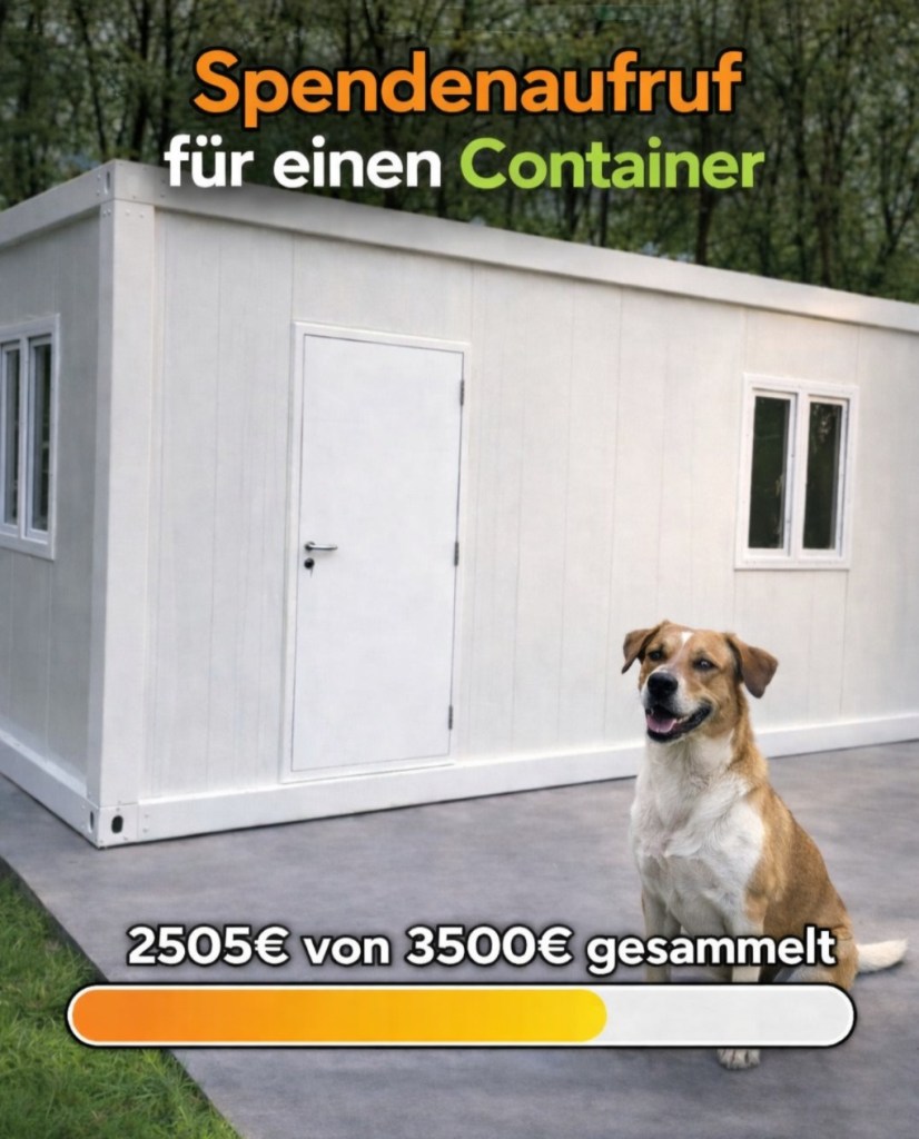 Er wird dringend benötigter Stauraum für Futter, medizinische Versorgung und Sachspenden sein. Er wird Schutz bieten vor Witterung, Ordnung schaffen im täglichen Chaos und die Arbeit vor Ort spürbar erleichtern. Und vor allem wird er dazu beitragen, dass die Tiere besser versorgt werden können.