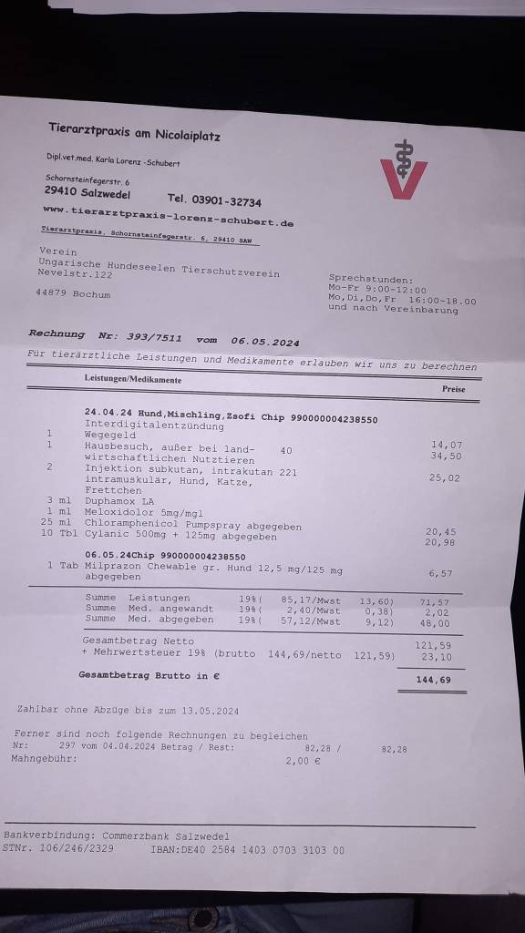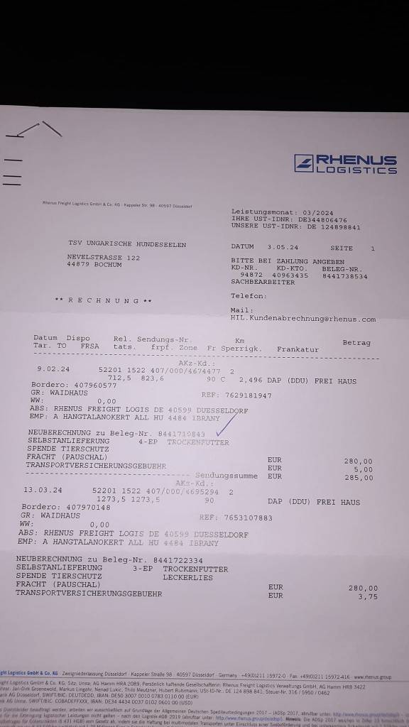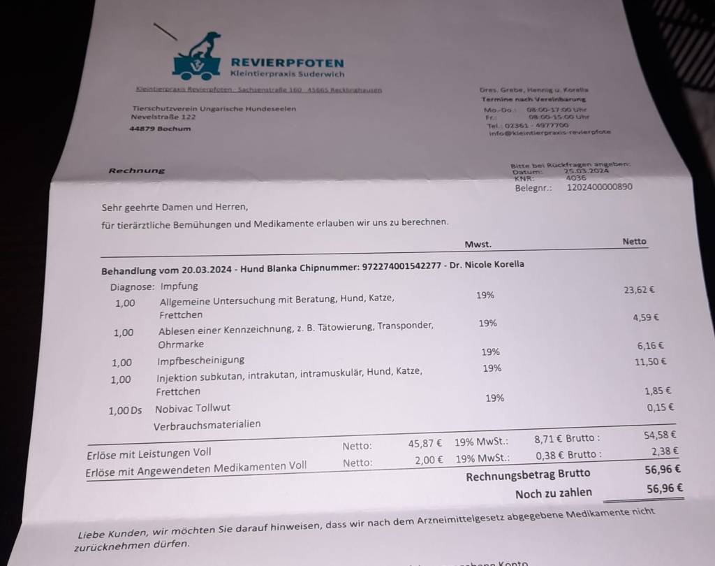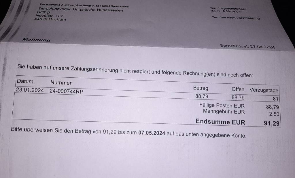 Aktuell stapeln sich bei uns Rechnungen iHv 3351,67€! Darunter unzählige Tierarztkosten, die teils Monate überfällig sind. Unsere Tierärztin war sehr verständnisvoll mit uns, aber auch sie arbeitet nicht umsonst. Eine Rechnung für die Spedition mit der wir immer Spenden nach Ungarn senden ist offen. Mit der Miete unserer Lagerräume sind wir im Rückstand. Der letzte Hundetransport muss bezahlt werden.