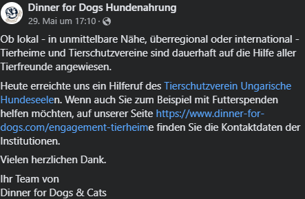 Wir sind Dinner for Dogs mehr als dankbar! Sie können uns aktuell leider keine Spende übermitteln, aber wollen uns dennoch unterstützen! Neben unzähligen Absagen ist selbst diese kleine Geste für uns ganz groß![]()