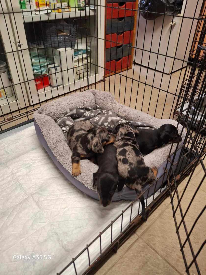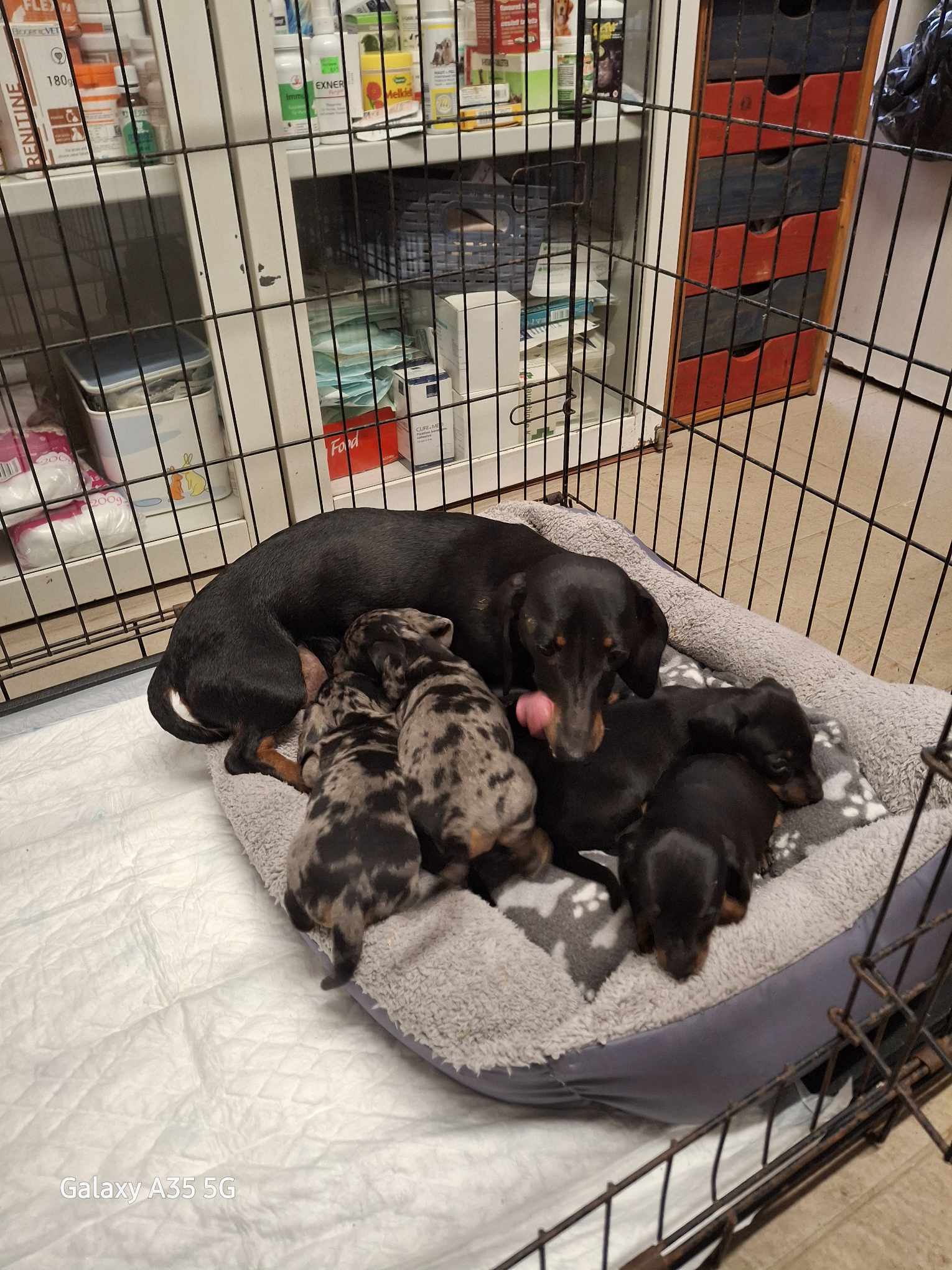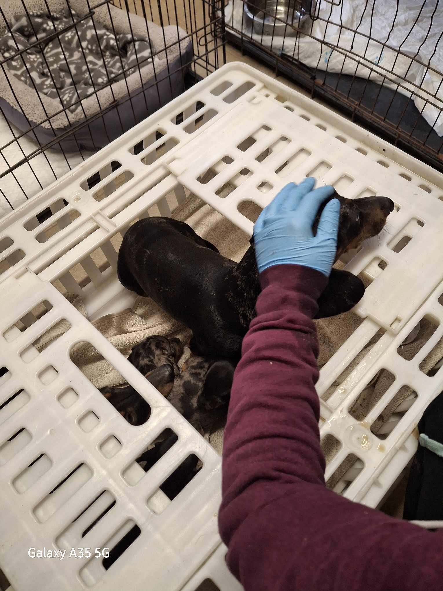 Nebst einem kleinen beigen und einem ebenso kleinen braunen Welpen hat diese Woche auch noch eine ganze Dackel-Familie Zuflucht in unserem Partnertierheim gefunden.