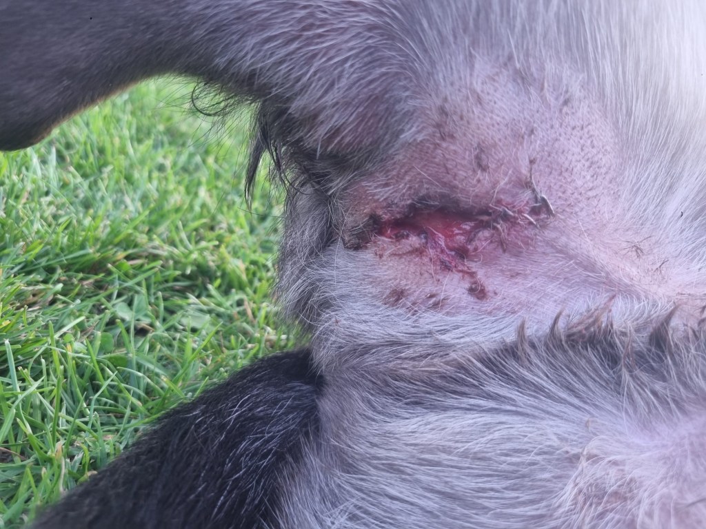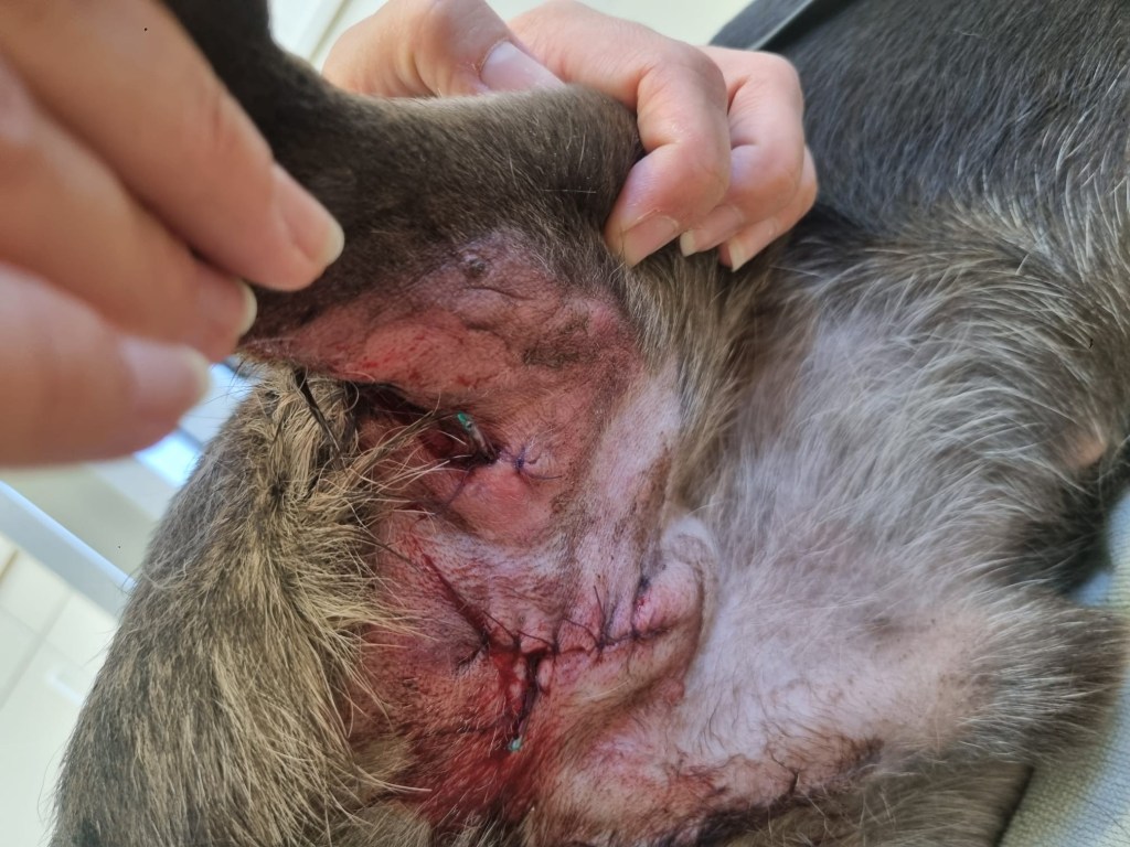 Sein Bein wurde die Tage darauf total dick, sodass sich die Klammern von alleine lösten. Beim Tierarzt wurde festgestellt, dass sich ein Antibiotika resistenter Keim eingeschlichen hat. Roiko musste sediert werden, damit seine Wunde ordentlich gereinigt, die Wunderänder abgeschnitten und die Wunde neu verschlossen werden konnte.