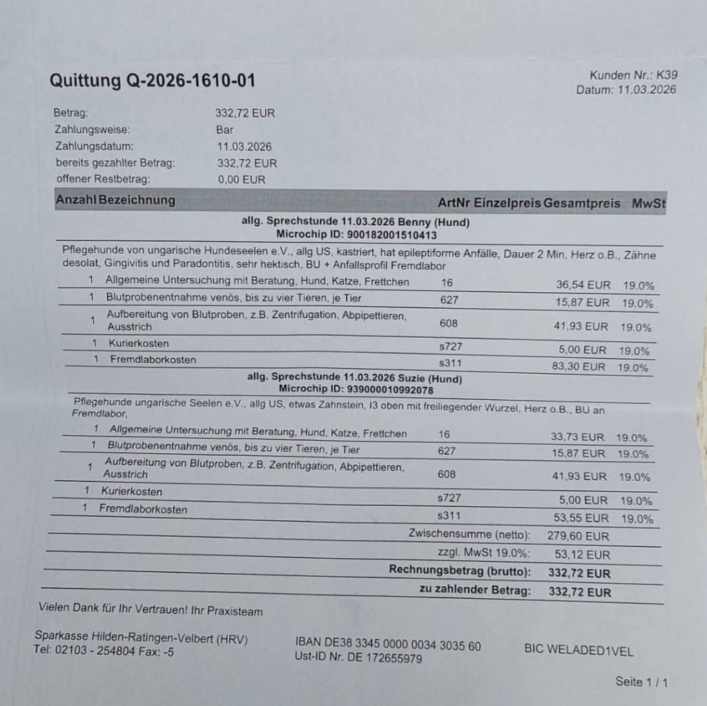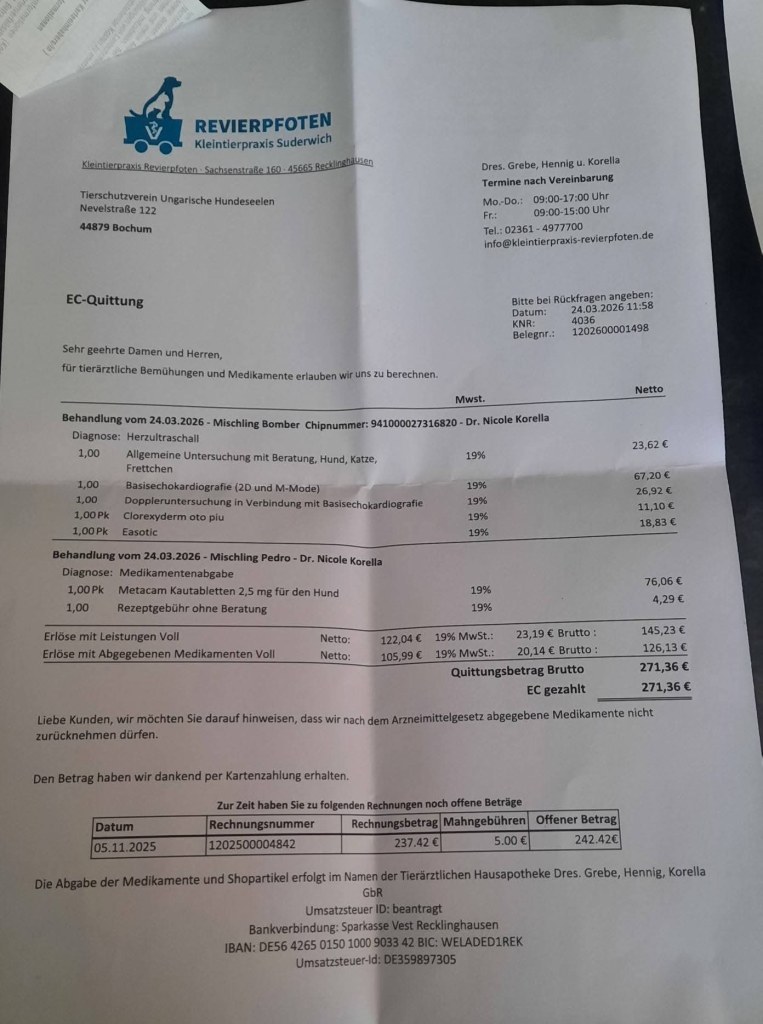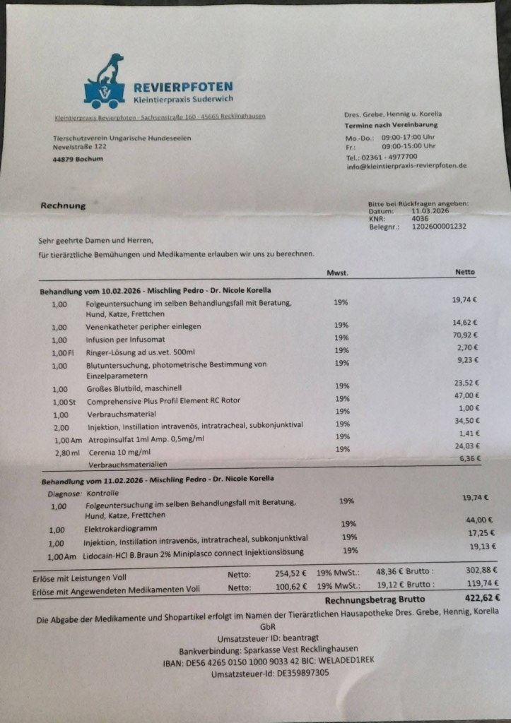 Offen sind hier außerdem 422,62€ für lebensrettende Maßnahmen für Gnadenplatzhund Pedro im Februar.