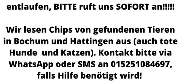 Sollten von uns vermittelte Hunde entlaufen, BITTE ruft uns SOFORT an!!!!! Wir lesen Chips von gefundenen Tieren in Bochum und Hattingen aus (auch tote Hunde
