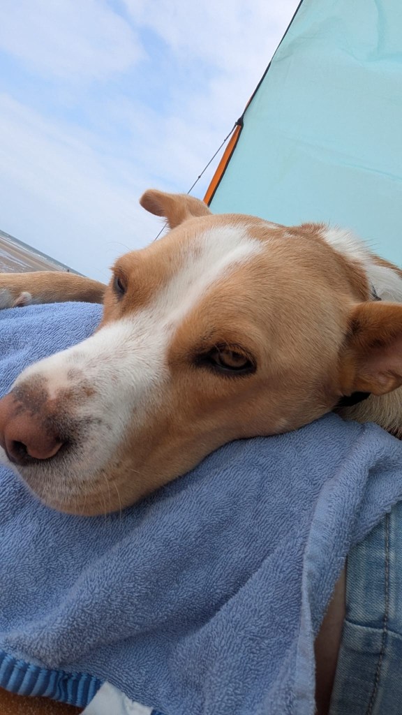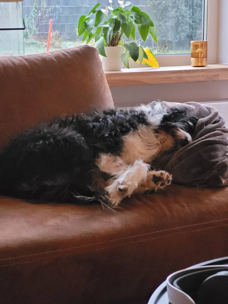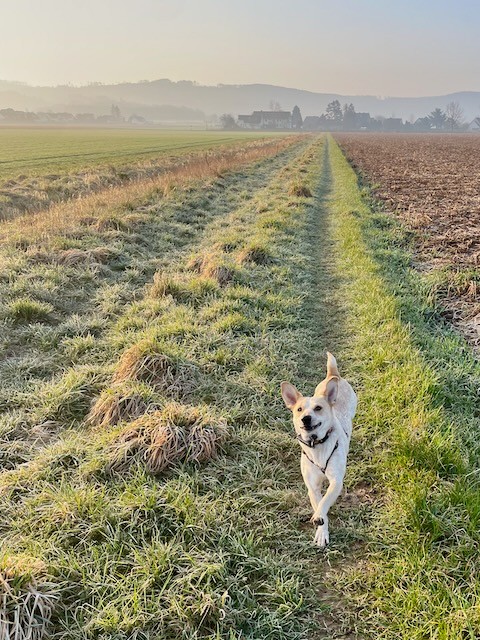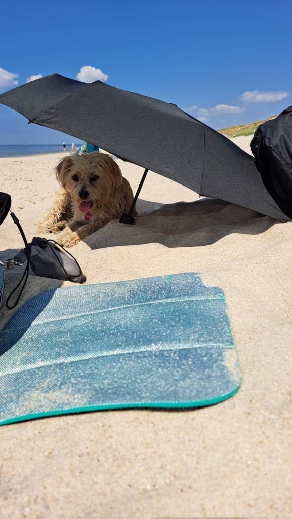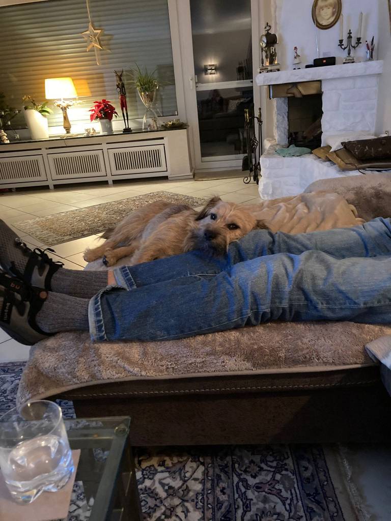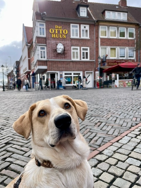 Otto hat sich toll eingelebt, bzw. wir haben uns toll zusammengefunden. Er ist ein unser Traumhund und wir sind unfassbar stolz auf ihn. Er liebt es, dazu zu lernen, macht uns sehr viel Freude. Natürlich hat Otto uns längst dahingehend um die Pfoten gewickelt, dass das anfänglich verordnete Sofa-Tabu gefallen ist, und für ihn scheint es nichts Schöneres zu geben, als sich abends an einen von uns – besser noch an beide – zu kuscheln und wohlig vor sich hin zu schnarchen. Er liebt seine täglichen Spaziergänge auf den Rheinwiesen, wo er bereits viele Freundi*nnen gefunden hat. Und er genießt die Felder, den Deich und den Nordseestrand in Ostfriesland, wo wir sehr oft an den Wochenenden mit ihm unterwegs sind. Glücklicherweise fährt er sehr gern bzw. schläft sehr gern im Auto, aber auch das Reisen mit Tram und Bahn konnten wir ihm mit mit ein paar Leckerli schnell schmackhaft machen. Hier, wie auch bei Restaurantbesuchen oder anderen Gelegenheiten gilt: Hauptsache, dabei sein. Otto nimmt’s, wie’s kommt.