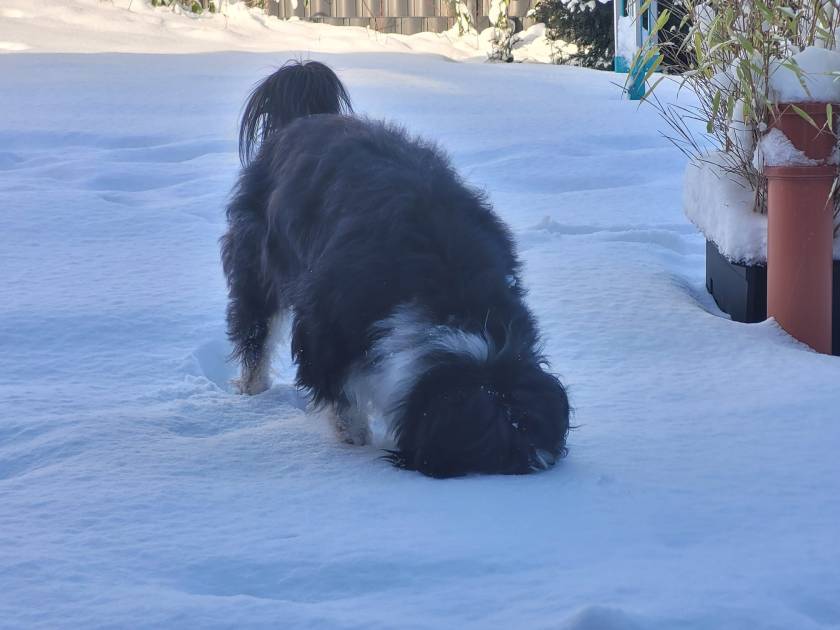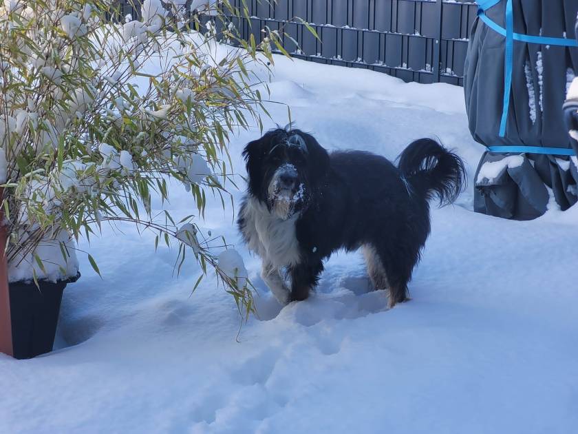 mein Name ist Snow (ehem. Sissy). Ich wohne jetzt seit fast 4 Monaten, bei meiner Hunde-Schwester Lucy, bei meiner Katzen-Schwester Phoebe, und bei meiner Mama Jess. Und soll ich euch was sagen!? Die läuft an so’nem Ding mit Reifen… Das heißt Rollator, oder so… Aber das macht mir garnix!!! Wir laufen trotzdem jeden Tag, durch die Grünanlagen, oder durch den Wald. Das ist alles total interessant…